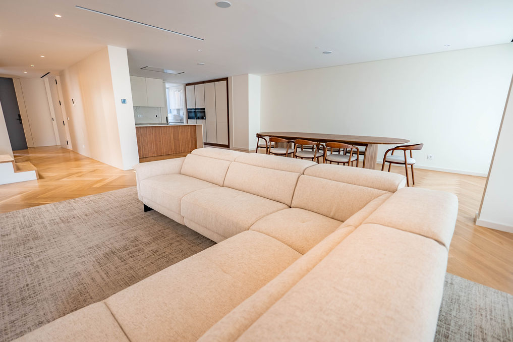 A espaçosa sala de estar, com 70.70 m², combina sofisticação e conforto. As amplas janelas permitem a entrada generosa de luz natural e enquadram vistas deslumbrantes. Portas de vidro ligam harmoniosamente o interior a um terraço amplo, criando uma conexão fluida com o exterior.