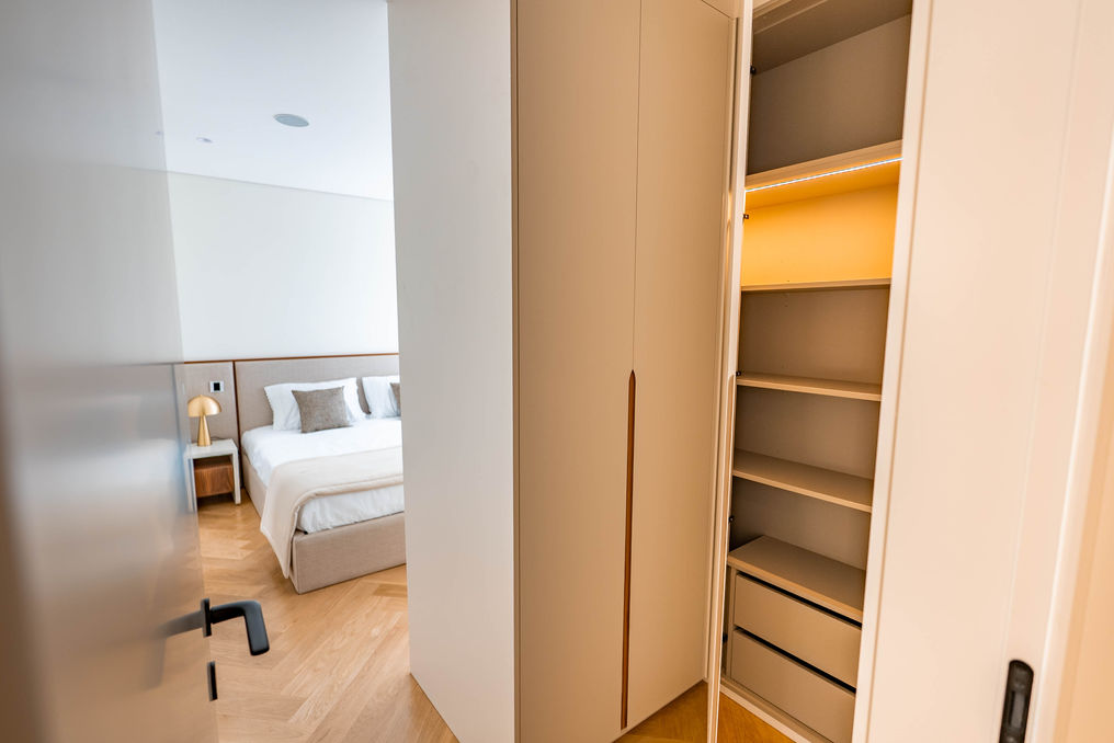 No 1.º piso, a zona privada inclui quatro suítes, todas com varandas que prolongam a ligação ao exterior. A suíte master, com 42.80 m², destaca-se pelo amplo walk-in closet e pelas vistas deslumbrantes sobre o jardim e terraço, proporcionando um refúgio de conforto e sofisticação.